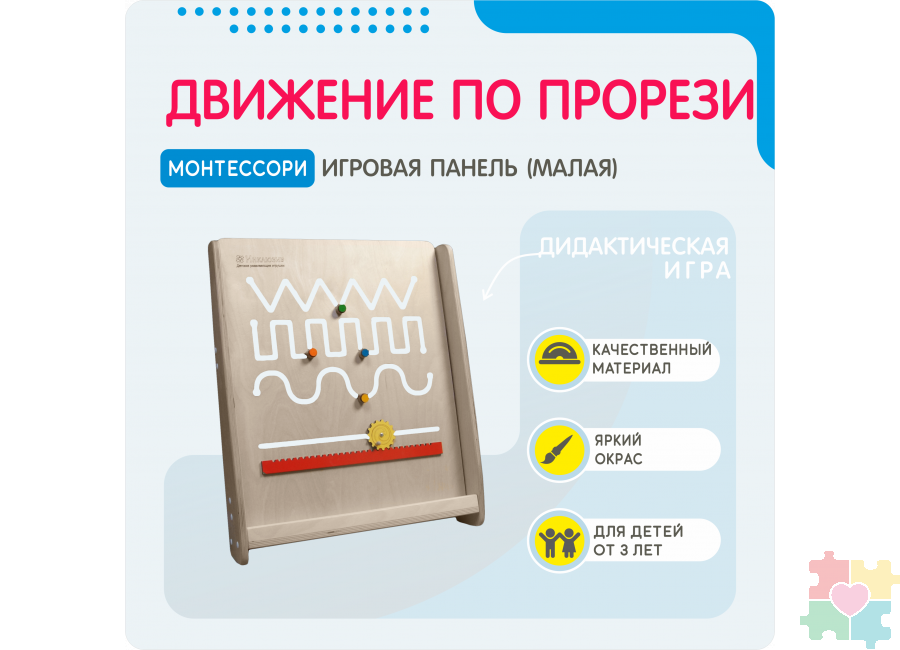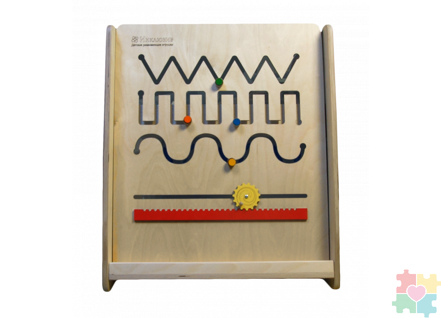 Вашему вниманию - превосходный развивающий модуль для дошколят - Монтессори игровая панель Движение по прорези (малая). Она поможет ребенку развить мелкую моторику, координацию движений и логическое мышление. Игровое поле панели содержит различные канавки: зигзагообразную, волнообразную и т.д. Ребенок должен передвигать цветные бегунки и шестеренку по канавкам, следуя определенному пути. Это помогает развить моторику рук и координацию движений, а также учит ребенка логическому мышлению и концентрации внимания. Эта игрушка выполнена из древесины, отполированной, отшлифованной и покрытой лаком, что обеспечивает безопасность и долговечность использования. Внимание! Настенная подставка для малой игровой панели не входит в состав комплекта - вы можете приобрести ее отдельно, отыскав у нас в каталоге.
