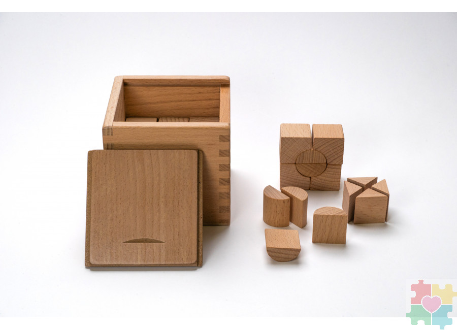 Третий: восемь маленьких кубиков, объединенных в один большой «куб из кубиков». Отличное подспорье в усвоении таких понятий, как «часть», «половина», «целый предмет», «одна четверть» и др.