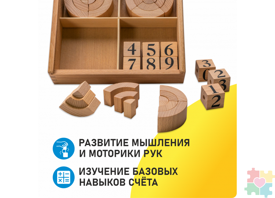 Модуль № 13 (5B), состоящий из 44 элементов разной формы (кубики, призмы, цилиндры и др.), учит ребенка создавать сложные сборные сооружения и конструкции (Башенки)