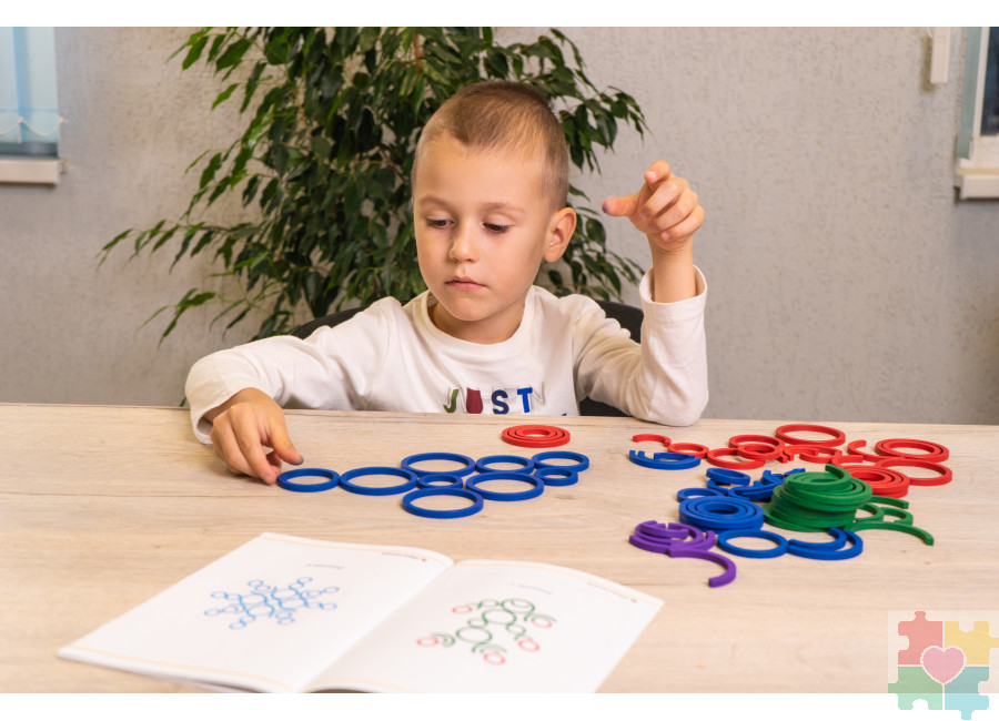 Модуль № 9 включает элементы, имеющие форму кольца, полукольца, круга, полукруга, дуги (кольца и полукольца). Отличное подспорье в развитии творческого воображения, когда из круглых и полукруглых линий можно создавать самые удивительные фигуры.