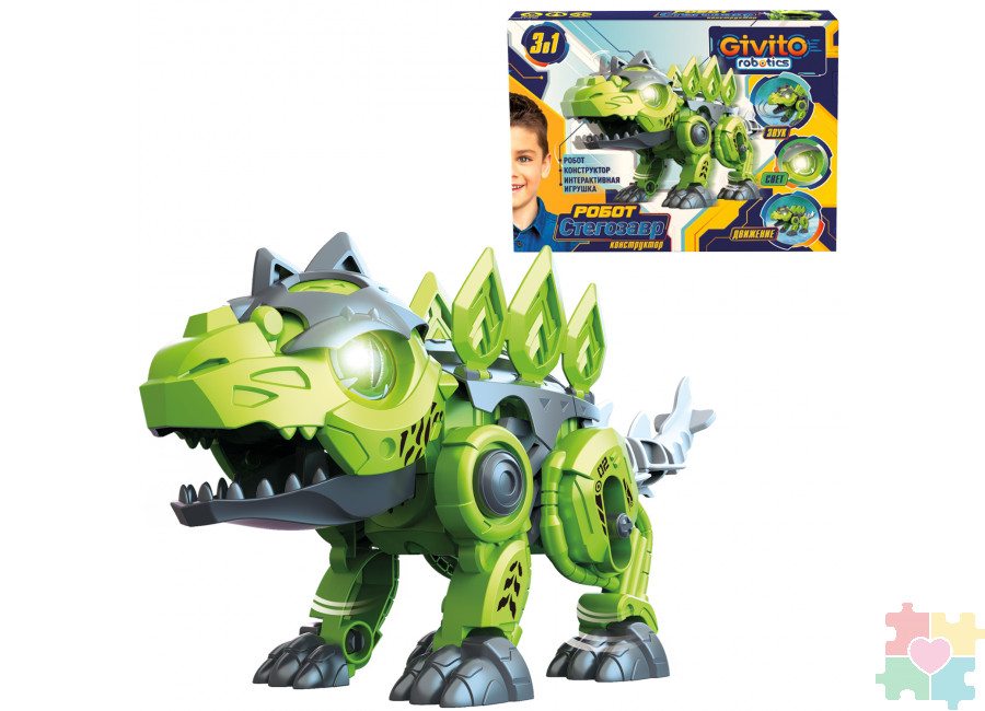 Игрушка робот интерактивный "Динозавр Стегозавр" 3в1 (конструктор 27 деталей, свет, звук). Серия: robotics.