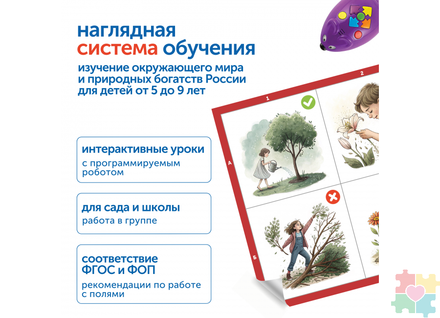 Комплект «Природные богатства России с РобоМышью» (без системы хранения) представляет собой самостоятельный комплект для организации тематических занятий и открытых уроков, где каждый модуль открывает детям новую страницу о природе нашей страны. Здесь можно встретить леса, ягоды, зверей, птиц, а ещё узнать, почему важно беречь родные просторы. РобоМышь помогает превратить урок в игру: она двигается по полю, а дети программируют её маршрут, чтобы найти, например, белку или узнать, где растёт кедр. Такой подход делает занятия живыми, а знания - по-настоящему запоминающимися.