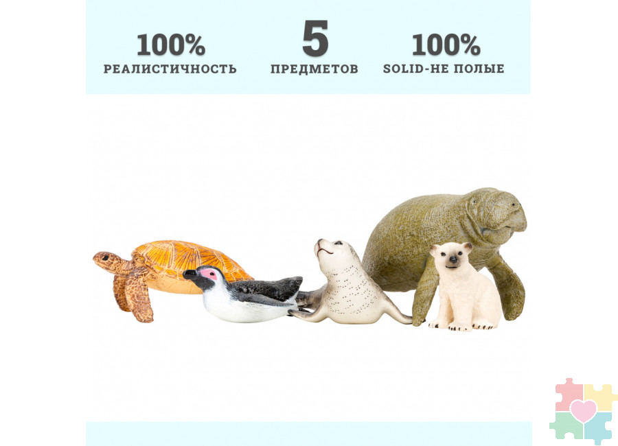 Фигурки игрушки серии "Мир морских животных": Ламантин, морская черепаха, тюлень, пингвин, белый медвежонок (набор из 5 фигурок животных)