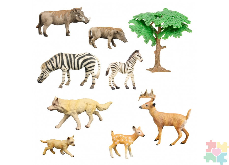Набор фигурок животных серии "Мир диких животных": 2 зебры, 2 бородавочника, 2 оленя, 2 волка (набор из 9 предметов)