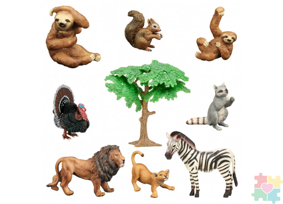 Набор фигурок животных серии "Мир диких животных": индюк, белка, 2 льва, енот, зебра, 2 ленивца (набор из 9 предметов)