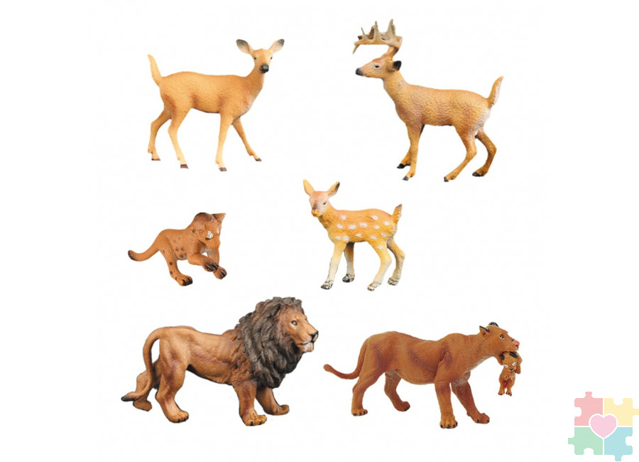 Набор фигурок животных серии "Мир диких животных": Семья львов и семья оленей (набор из 6 предметов)