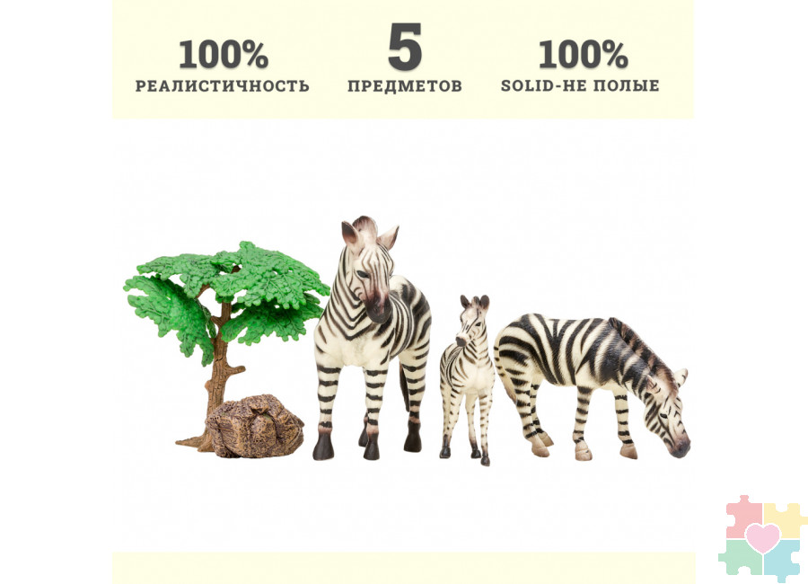 Этот набор состоит из семьи зебр (одна взрослая особь и две молодые), которых прекрасно дополняют элементы для создания локаций дикой природы - камень и дерево. Подарите маленькому ценителю дикой природы этот замечательный набор игровых фигурок. Семья зебр надолго займет внимание любознательного малыша и подскажет сюжеты для игр. Чтобы найти необходимую информацию о жизни полосатых лошадок, почитайте вместе с ребенком энциклопедии или посмотрите кино. Фигурки из литого пластика сделаны по современной технологии и передают все особенности анатомического строения зебр. Мелкие детали фигурок прокрашены вручную. Перед созданием макетов игрушек на производстве проводят консультации со специалистами в области зоологии. Фигурки обладают прочностью и не боятся повреждений во время игры. На нашем сайте имеется большой выбор наборов данной серии. Приобретая наши игровые комплекты, вы поможете ребенку пополнить его коллекцию. Товар сертифицирован. По правилам техники безопасности не рекомендуется разрешать детям взаимодействовать с упаковкой игрушек.