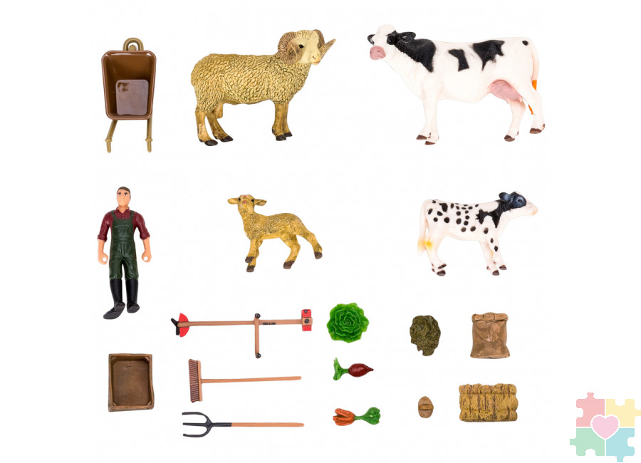 Увлекательный игрушечный набор для детей, где домашние животные, а также люди и различный инвентарь, представлены в виде реалистичных фигурок. С такими фигурками можно придумать достаточное количество самых разнообразных и незабываемых сюжетных игр, где дети смогут развить мелкую моторику (фигурки удобно держать в руке, переставлять, крутить, строить сооружения, перевозить животных), свое воображение и фантазию, а также, играя с фигурками в группе, дети смогут развить навык коммуникации, связность речи, наблюдение и внимание. Представленный набор будет очень интересным, а главное весьма полезным приобретением, ведь дети не только смогут играть, но и развиваться, расширят свой кругозор и научатся беречь окружающий мир.
