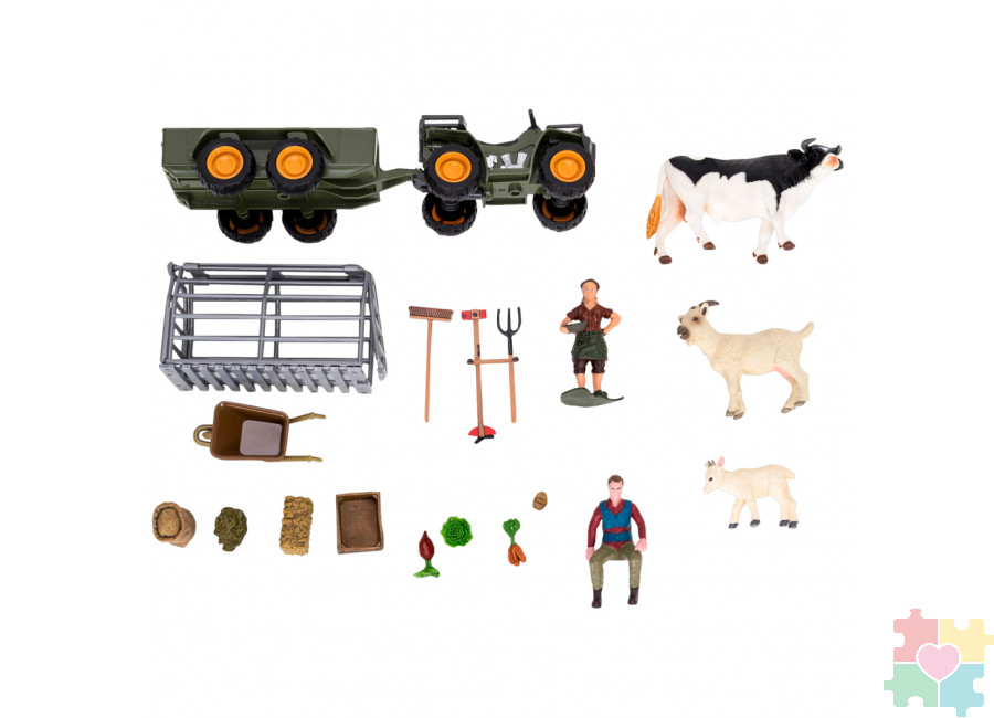 Набор фигурок животных серии "На ферме": Ферма игрушка, бык, козы, квадроцикл для перевозки животных, фермеры, инвентарь - 22 предмета