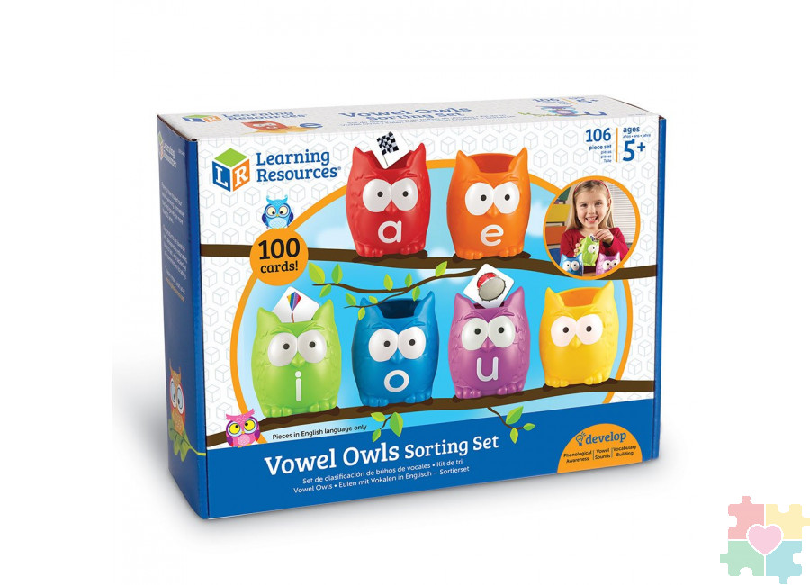 Игровой набор развивает навыки распределения и сортировки. С помощью специальных карточек и фигур сов ребенок выучит все гласные алфавита, научиться отличать короткие от длинных гласных.