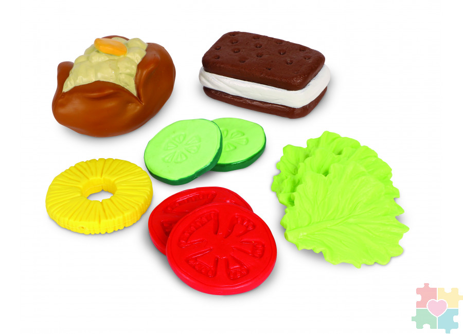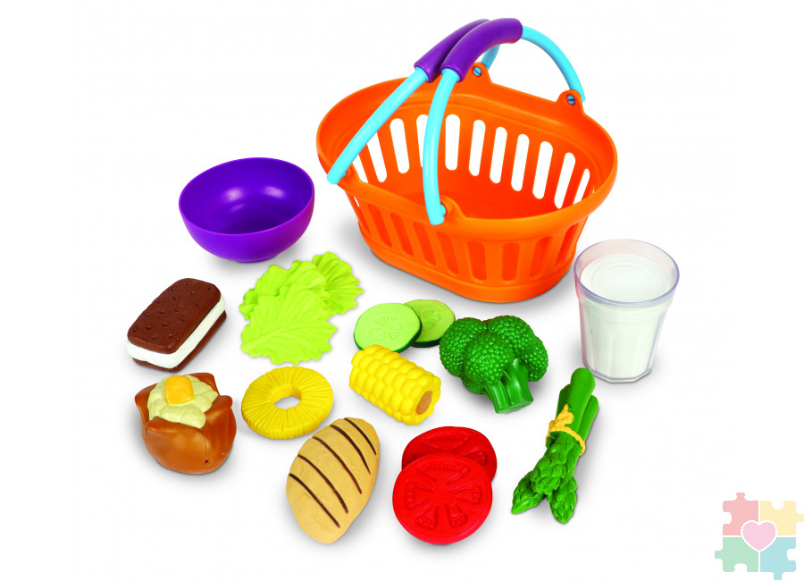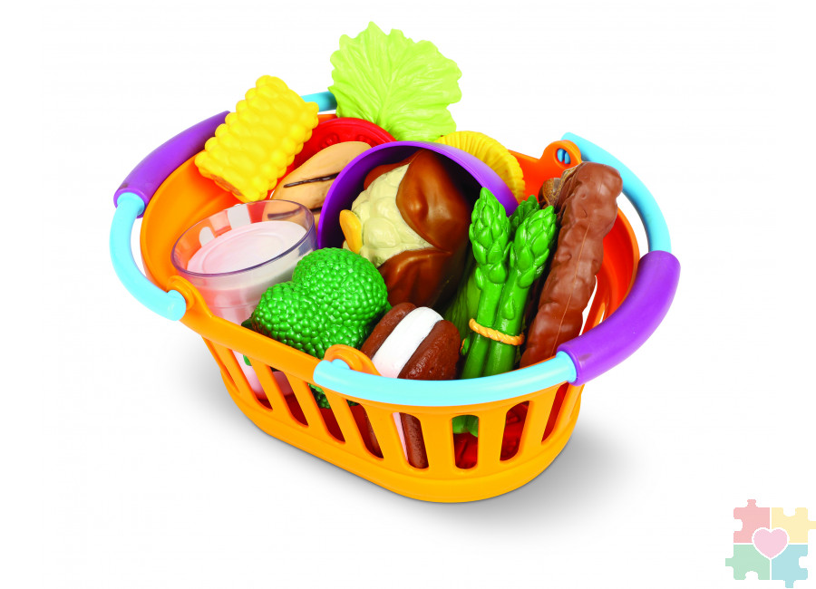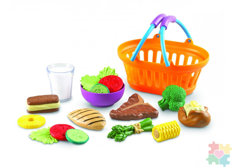 Красочный игровой набор познакомит детей с питанием с самого раннего возраста. В набор входят миска, стакан молока, 15 игрушек, очень реалистично оформленных в виде различных блюд: стейк, куриная грудка, спаржа, брокколи, кукуруза в початках, печеный картофель, три листа салата, два ломтика помидора, два ломтика огурца, кольцо ананаса и сэндвич с мороженым. Помимо всего вышеперечисленного, комплект включает в себя карточки с упражнениями и учебное пособие. Детали на кусочках игровой еды выглядят как в реальной жизни .Массивные прорезиненные игровые элементы обеспечивают безопасные ролевые игры для малышей, имеют оптимальный размер для комфортной игры и помогут развить словарный запас, языковые и социальные навыки детей в раннем возрасте. Яркие прорезиненные игровые предметы для ужина позволяют детям не только играть, но и проявлять фантазию, развивать логическое мышление и расширять кругозор. Изделия поставляются в прочной пластиковой корзине для покупок, которая также очень удобна для хранения. Подходит для детей в возрасте от 2 лет.