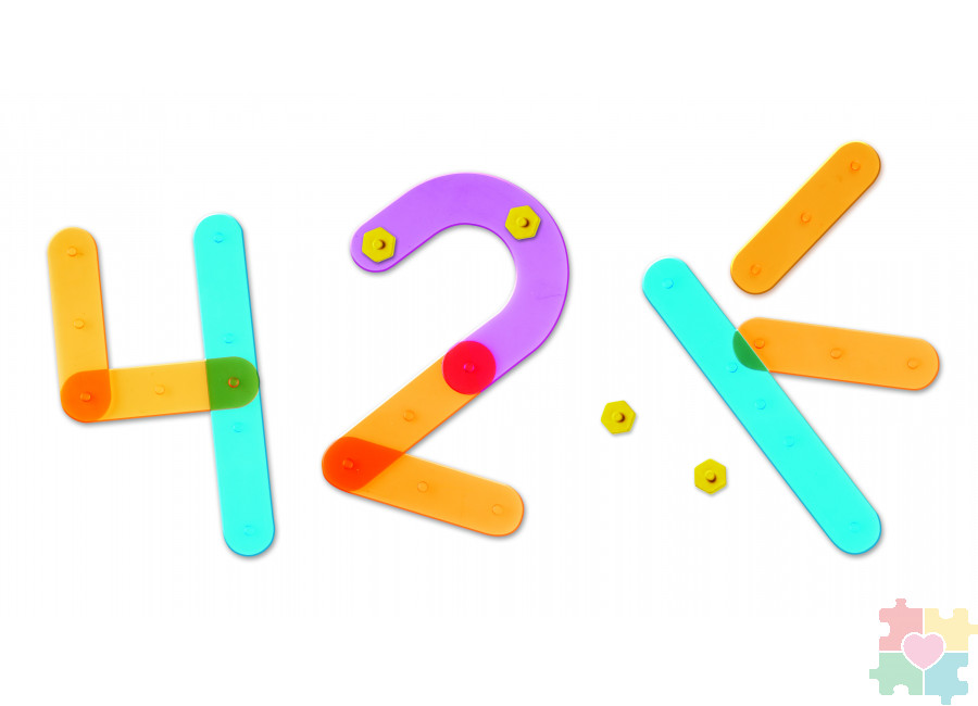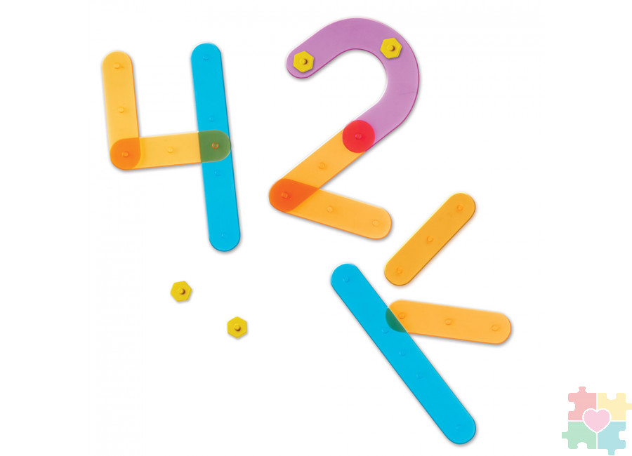 Набор состоит из полупрозрачных элементов (больших и маленьких прямых и изогнутых палочек), из которых можно собрать цифры от 0 до 9. Детали крепятся между собой при помощи болтов, входящих в комплект. Для удобного пользования в составе набора уже есть карточки со схемами сборки каждой цифры и указанным на них количеством необходимого материала. Комплект подходит для индивидуального использования ребенком и для обучения до 4-х детей одновременно. Детали изготовлены из безопасного и прочного пластика. Прекрасно подходит для игры на световом столе. Станет прекрасным игровым пособием для веселого обучения конструированию и планированию, счету и развитию навыков распознавания чисел, а также усидчивости, умению слушать учителя и выполнять поставленную задачу. Товар сертифицирован. Поставляется в удобной для компактного хранения коробке. Подходит для использования детьми от четырех лет.