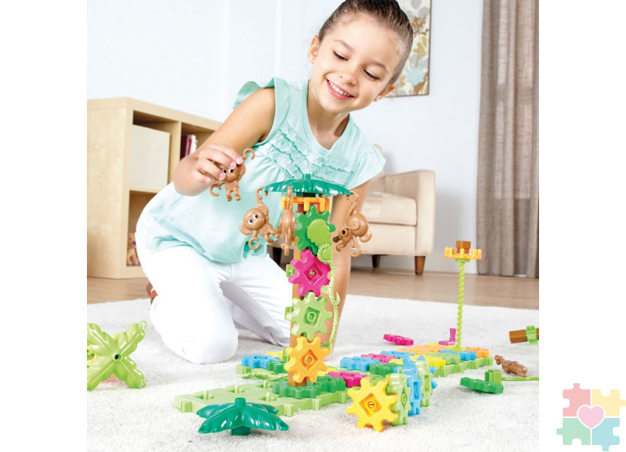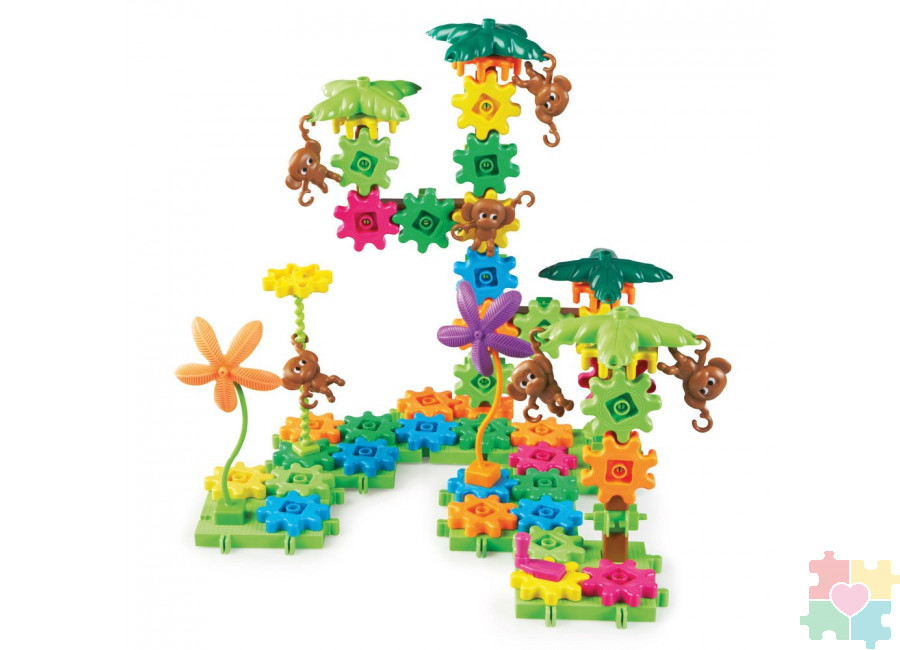 - В комплекте представлено 100 деталей из прочного пластика (шестеренки, лозы винограда, деревья, фигурки обезьянок, платформы).