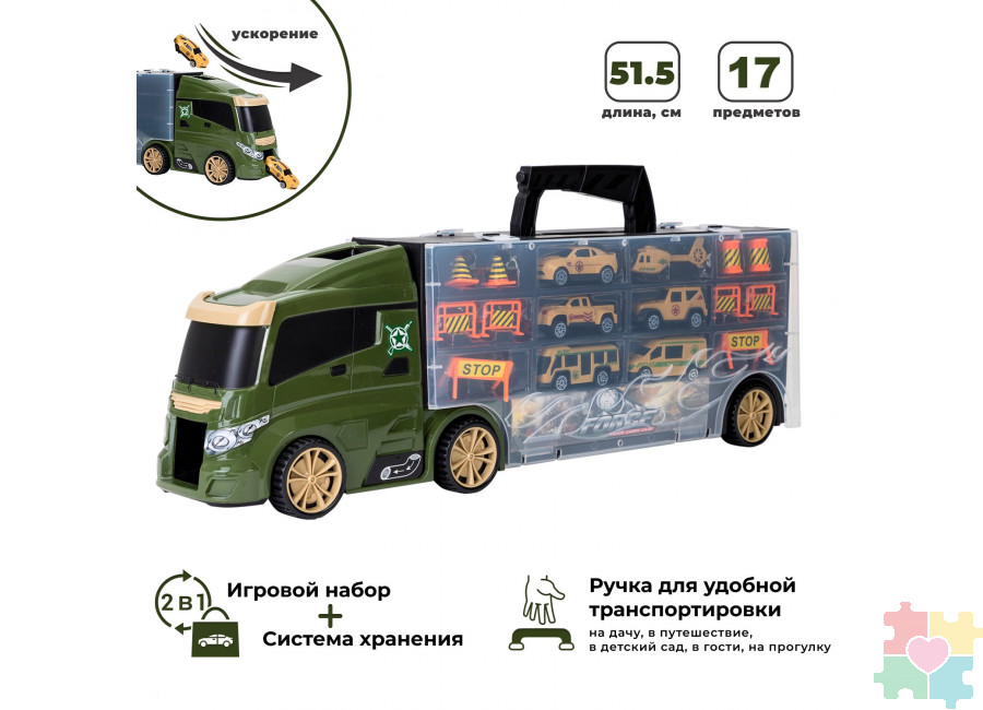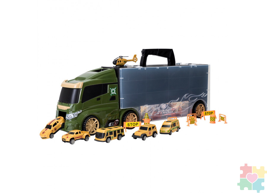 Набор машинок серии "Милитари" (Автовоз - кейс 51,5 см, зеленый, с тоннелем. 4 машинки, 1 автобус, 1 вертолет и 10 дорожных знаков)
