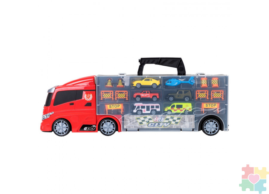 Набор машинок серии "Мой город" (Автовоз - кейс 51,5 см, красный, с тоннелем. 4 машинки, 1 автобус, 1 вертолет и 10 дорожных знаков)