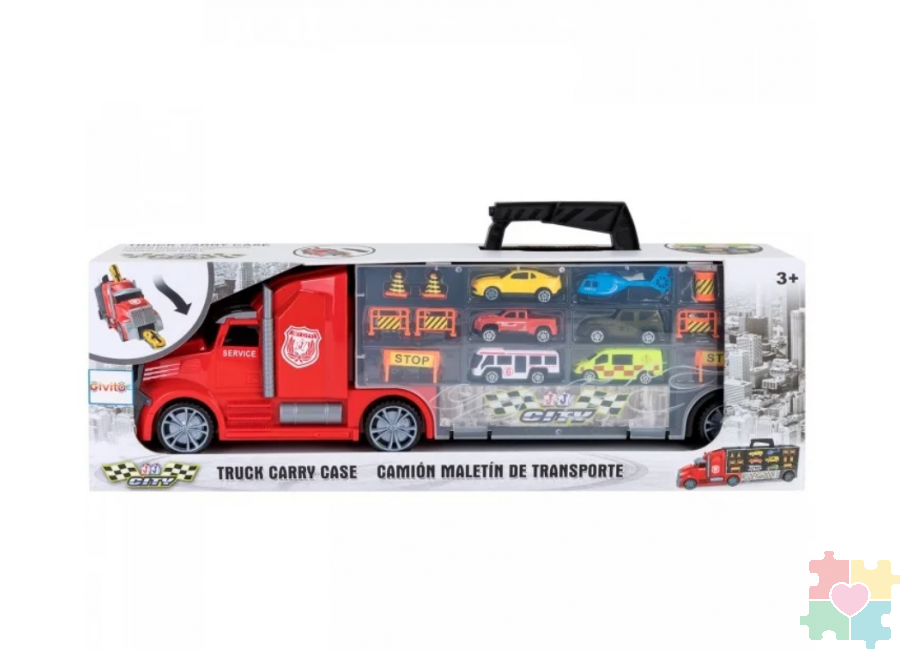 Игрушечный набор машинок "Мой город" разработан для мальчиков от 3 лет и старше. Для его изготовления используются высококачественные цветные материалы (пластик), прошедшие сертификацию в соответствии с международными стандартами качества и абсолютно безопасные для детей. Игровой набор способствует психическому и физическому развитию детей, стимулируют их воображение и фантазию. Яркие цвета поднимают настроение и тренируют цветовосприятие. В набор входит грузовой красный автомобиль с тоннелем "Автовоз-кейс 54см", четыре маленькие машинки, автобус, вертолет и дорожные знаки. Все колеса автомобиля подвижные, имеется удобная ручка для переноски. Автовоз - ретро прототип с высокой детализацией. Каждый автомобиль из набора по своему индивидуален. Большой автомобиль - система хранения для мини транспорта.
