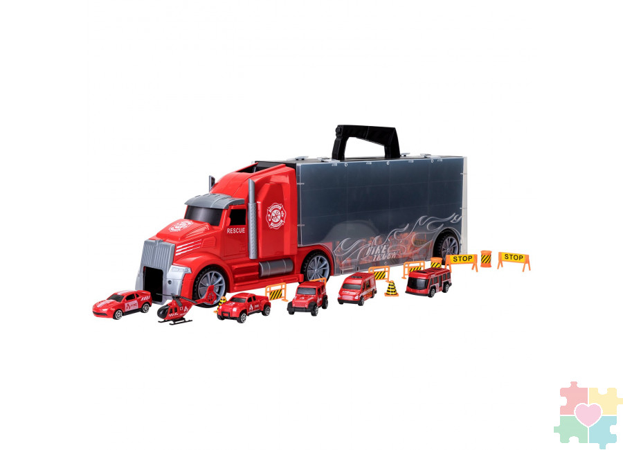 Набор машинок серии "Служба спасения" (Автовоз - кейс 54 см, красный, с тоннелем. 4 машинки, 1 автобус, 1 вертолет и 10 дорожных знаков)