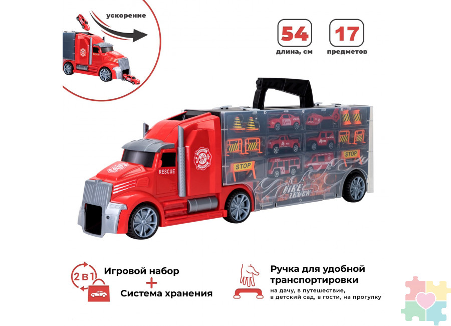 Игры с транспортом тренируют: визуальное восприятие, слуховое восприятие, координацию движений, внимание и фантазию. Игрушка изготовлена из материалов высокого качества, безопасных для детского здоровья. Спецтехника каждому ребенку позволит почувствовать себя в роли настоящего спасателя и полностью погрузиться в игровой процесс. Набор пластмассовых развивающих машинок оснащен удобной ручкой, поэтому его можно брать с собой куда угодно, играть на площадке или дома. Автовоз "служба спасения" размером 54см, не только грузовая машина, но и в кузове можно хранить маленький транспорт и дорожные знаки в отдельных ячейках. В кабинку встроен ускоритель машин, для ещё больше динамики в игре. Колеса грузовика подвижные, что позволяет ему свободно двигаться вперёд/назад. Все машинки окрашены в красный цвет.