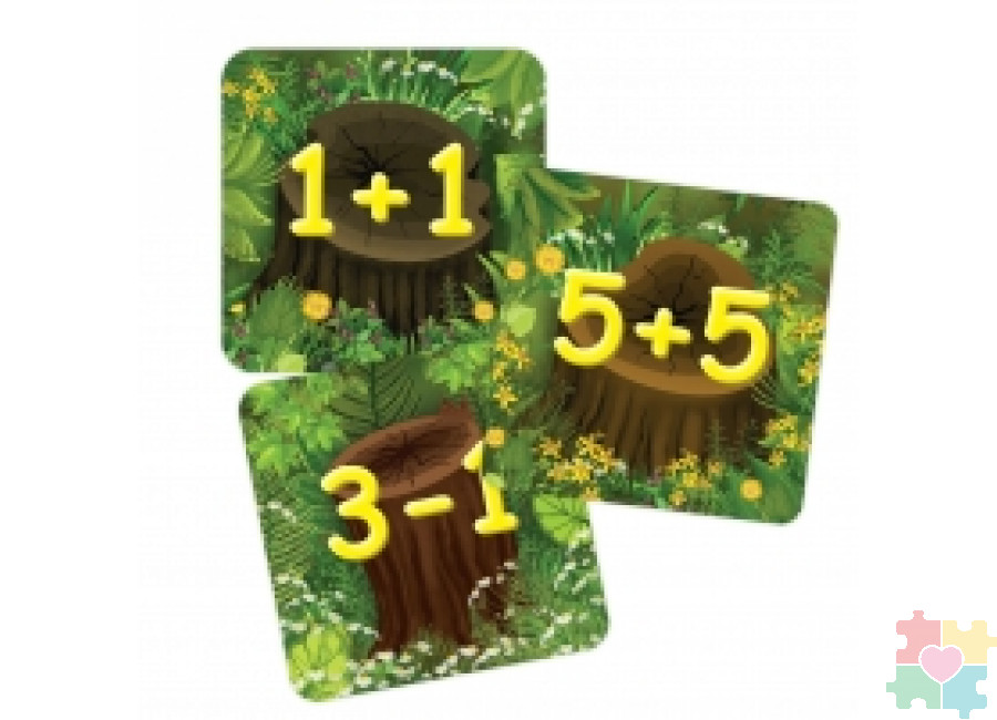 Красочный и яркий набор, состоящий из обучающих карточек, которые помогут Вам научить ребенка сложению и вычитанию без усилий и с легкостью! Начальная математика как правило даётся детям непросто. Но если обучать играя, то ребенок точно получит все необходимые знания. Карточки — это пеньки, по которым малыш должен добраться до секретного персонажа, затаившегося в лесной чаще. Чтобы «пройти пенек», ребенку необходимо верно решить примеры на карточках. Важно не показывать карточку с тайным персонажем, чтобы у малыша был интерес играть дальше. Игра очень гибкая, и подойдет как для деток, которые только начинают осваивать числа, так и для тех, кто уже хорошо умеет решать примеры. На одной стороне каждой карточки расположен пример, где нужно сложить цифры, а на другой отнять. Чтобы начать игру, нужно положить загадочную карточку с призом вверх знаком вопроса, так ребенок не будет знать, кого ему нужно найти. Далее просто выберете карточки с теми примерами, которые нужно решить малышу. Теперь объясните ребенку, что ему нужно выкладывать карточки от края стола к центру. В конце концов он дойдет до загадочной карточки и будет знать, что победил! Когда ребенок освоится, он может решать примеры сразу на обеих сторонах карточек. А также отбирать карточки, на которых в итоге решения примера получаются одинаковые числа.