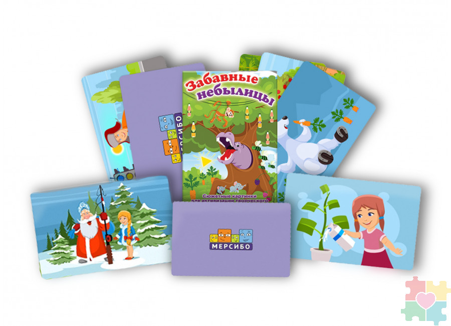 Комплект из 27 карточек с разноцветными картинками-небылицами.