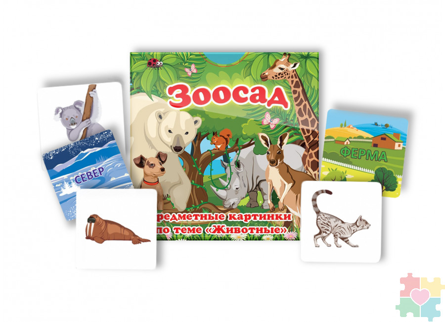 Комплект красочных и увлекательных карточек, предназначенный для знакомства с лексической темой “Животные”. С помощью этих карточек дети могут: изучить новые названия животных и повторить им уже известные, описать повадки зверей и их внешний вид, сравнить животных между собой по различным признакам, поиграть в игру “Четвёртый лишний”, распределить по лексическим темам. Набор карточек классифицирован по следующим лексическим темам: “Домашние животные”, “Животные жарких стран”, “Животные России”, “Животные Крайнего Севера”. Карточки можно использовать для индивидуальной работы с ребёнком, а также на групповых занятиях, что делает игру ещё занимательнее, так как увеличивается количество дополнительных игр. Карточки делятся на основные, где изображены разнообразные животные (кот, собака, кенгуру, жираф, медведь, волк) и дополнительные, на которых указано место обитания животных (лес, ферма, север, южные страны). Вариант простой игры. Ребёнок выбирает любую понравившуюся карточку с животным, а вы раскладываете дополнительные карточки с местами обитания и предлагаете ребёнку выбрать то место, где обитает это животное. Используя эти карточки на групповых занятиях, можно проводить увлекательную викторину и занимательные соревнования. Например, кто больше всех приведёт в пример животных, обитающих в определённой местности, указанной на заранее подготовленной дополнительной карточке.