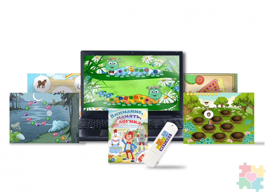 На этой флешке содержится коллекция из 24 тщательно подобранных игр для того, чтобы помочь развить у ребенка логическое и пространственное мышление, память, моторику, зрительную и слуховую память. Каждая игра обладает интересной историей и сюжетом, что позволит ребенку с удовольствием и интересом обучаться. Тренировка памяти не будет в тягость для малыша! В каждой игре Вы можете настроить уровень сложности, в зависимости от подготовки ребенка и его особенностей. Персонажи всех игр озвучены актерами, а составляющие игр разработаны специалистами в области развития детей. На этой флешке находятся пять блоков с играми, каждая из которых помогает развивать различные качества: слуховое внимание, мелкую и крупную моторику, различные виды мышления, зрительную память. Например, в каких-то играх ребенок должен запомнить, где появлялись забавные зверушки, а потом щелкнуть мышкой в местах, которые он запомнил. Или прослушав инструкции веселого лесничего расположить насекомых в нужные места. И это только малая часть игр!