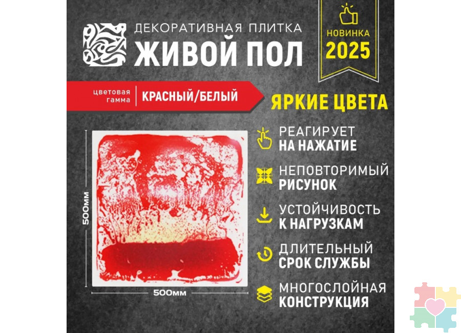 Рады представить Вам нашу новинку — это декоративная плитка "Живой пол". Представленный вариант выполнен в красном и белом цветах, а в ассортименте у нас — еще 8 вариантов расцветок! Каждый шаг по такой плиточке создает неповторимые визуальные эффекты — все это благодаря термостойкому цветному гелю, который реагирует на давление. Такое напольное покрытие дает возможность создавать абстрактные узоры, которые никогда не повторяются, что делает её оптимальным выбором для тех, кто хочет добавить изюминку в интерьер. Благодаря своим прочным материалам, плитка не только красива, но и долговечна — срок службы до десяти лет.