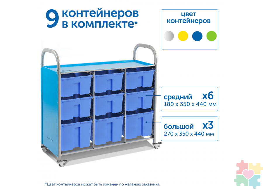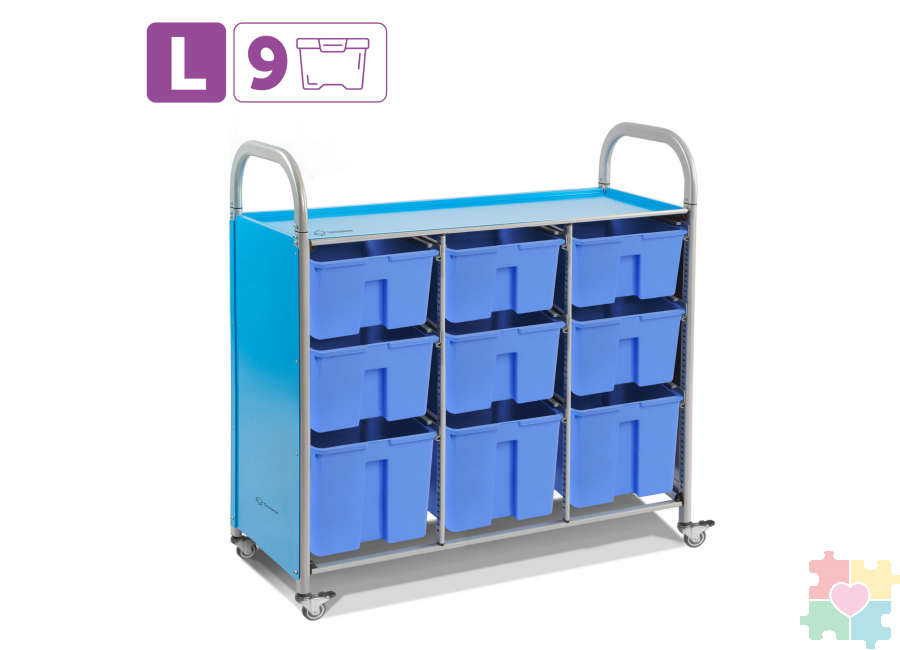 Удобное и вместительное решение для хранения и транспортировки учебных материалов, игрушек или инструментов представляет собой мобильный стеллаж L с 9 контейнерами. Компактные габариты позволяют разместить его даже в небольших помещениях, сохраняя полный доступ ко всем лоткам. Тележка изготовлена из прочной стали и пластика, что делает ее устойчивой к ежедневным нагрузкам. Направляющие можно регулировать по высоте, чтобы контейнеры не выпадали при движении. Подходит для детских садов, школ и других учреждений, где важны порядок и мобильность.