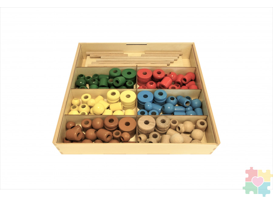 Этот комплект психолога предназначен для занятий с детьми от 3-х лет. Помогает научить ребенка замечать различия в одинаковых, на первый взгляд, предметах. Все части набора функционируют – короб предназначен для хранения составляющих, а его крышка является основанием для сборной конструкции, чем-то напоминающей геоборд. Деревянные штырьки необходимо вставить в любое отверстие крышки, а дальше начинается самое интересное – педагог, воспитатель или даже родитель собирает «пирамидку», используя это основание и бусины из набора (представляют собой окрашенные и неокрашенные объемные фигуры – цилиндр, шар, кубик, «блинчик» и т.д.). Задача ребенка – повторить «пирамидку» в точности за взрослым, не ошибившись в формах и цветах бусин. Набор разработан по специальной методике, которая помогает, помимо внимательности, развить в ребенке такие полезные и необходимые качества, как усидчивость, терпеливость, наблюдательность, логическое и критическое мышление, навыки базового конструирования. Все детали комплекта изготовлены из экологически чистых материалов, на производстве тщательно все острые кромки и углы, а поверхности – шлифуются. Благодаря высокому качеству обработки каждой детали игрушки получаются абсолютно безопасными для ежедневного использования.