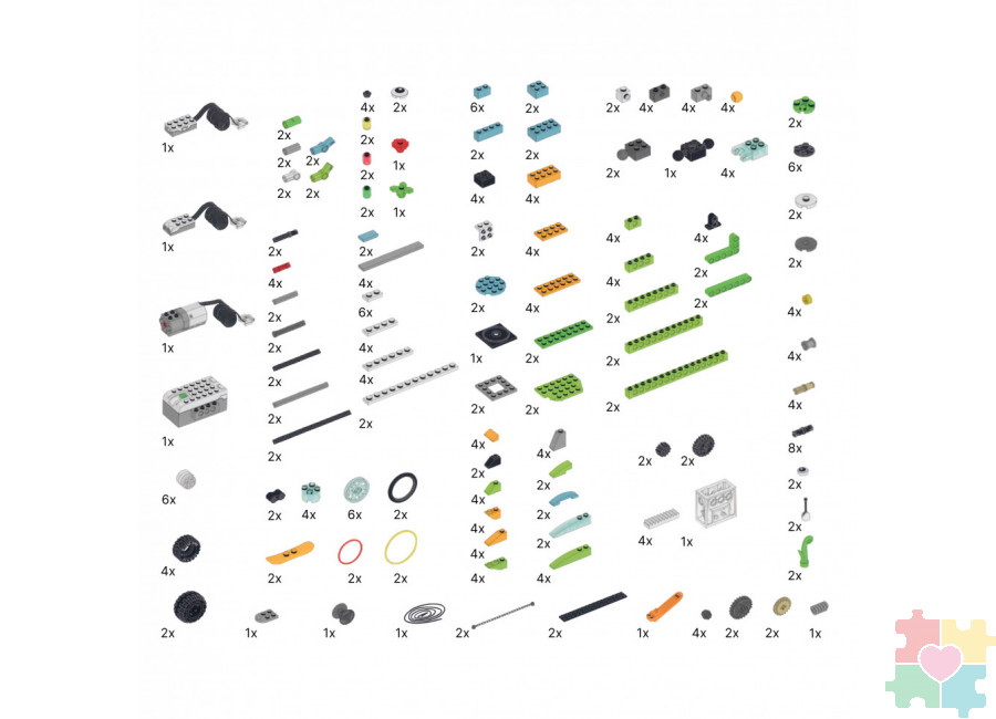 - Электронные элементы: Смартхаб, Малый электромотор, Датчик расстояния, Датчик наклона, Аккумуляторная батарея.