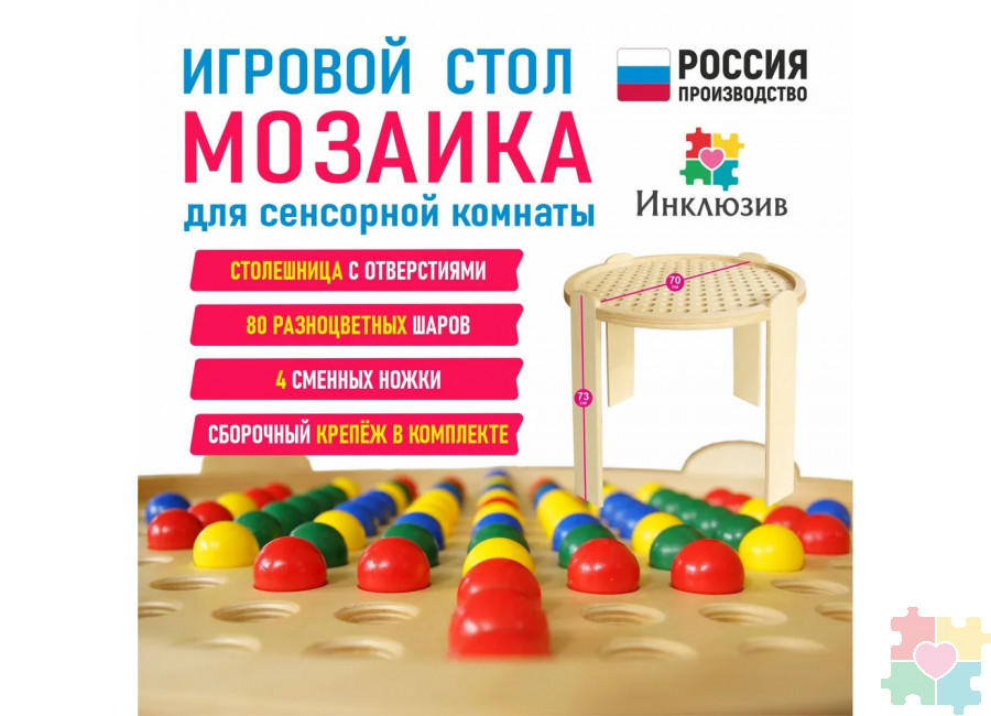 Игровой стол "Мозаика" - это любимая детская игра в мозаику в новом исполнении. Отдельный стол и разноцветные шары делают раскладывание по цветам более увлекательным.