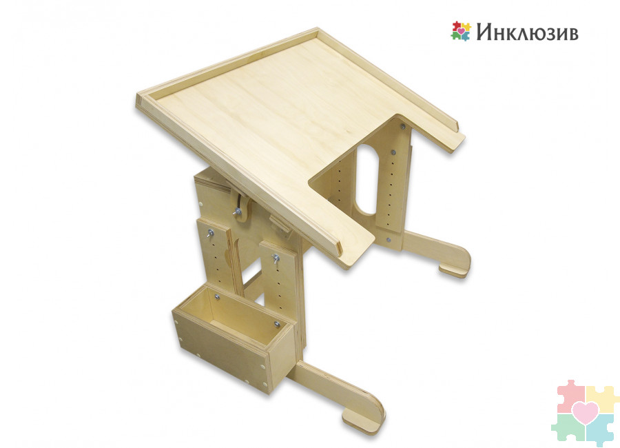 Стол для детей с ДЦП предназначается для реабилитации ребенка в сидячем положении. Стол многофункциональный, имеет ряд настроек, по высоте, углу наклона, удобству посадки, все эти функции призваны помочь ребенку в адаптации и развитию умений и навыков. Материалы изготовления экологически чистые, стол изготовлен из фанеры толщиной 16мм., сорт высший, все детали покрыты безопасным лаком. Снизу на ножках стола предусмотрены площадки для установки колесиков, для удобства перемещения стола (идут в комплекте). Сбоку предусмотрен объемный отсек для хранения, который также имеет регулировку по высоте. Со столом рекомендуется использовать стул для детей с ДЦП, который также имеет ряд функциональных настроек для удобства посадки ребенка. Наше изделие по достоинству оценили уже многие преподаватели в коррекционных центрах.